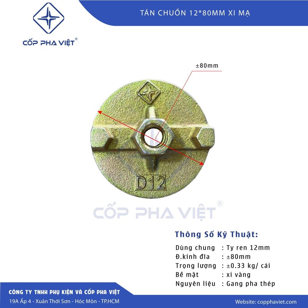 Đường kính 12mm và chiều dài 80mm được tính toán chính xác, phù hợp với tiêu chuẩn kỹ thuật xây dựng, đảm bảo sự tương thích với các loại ty ren thông thường. Độ chính xác cao trong gia công giúp đảm bảo sự liên kết chặt chẽ giữa tán chuồn và ty ren, tránh hiện tượng lỏng lẻo, gây ảnh hưởng đến độ bền của kết cấu cốp pha.
